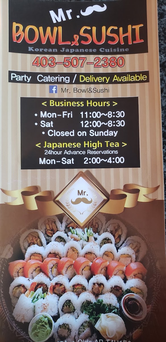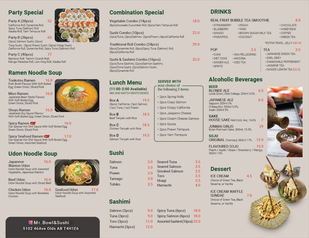 Introducing Mr. Bowl & Sushi, a delightful culinary gem in Olds, Alberta, that specializes in authentic Japanese and Korean cuisine. Located at 5102 46 Ave, this cozy eatery boasts an inviting atmosphere and exceptional service. The menu is a vibrant tapestry of flavors, featuring Japanese Green Tea, an array of juices like Apple and Sparkling Water, and a selection of enticing combination specials such as the Sushi & Sashimi Combo and Traditional Roll Combo.